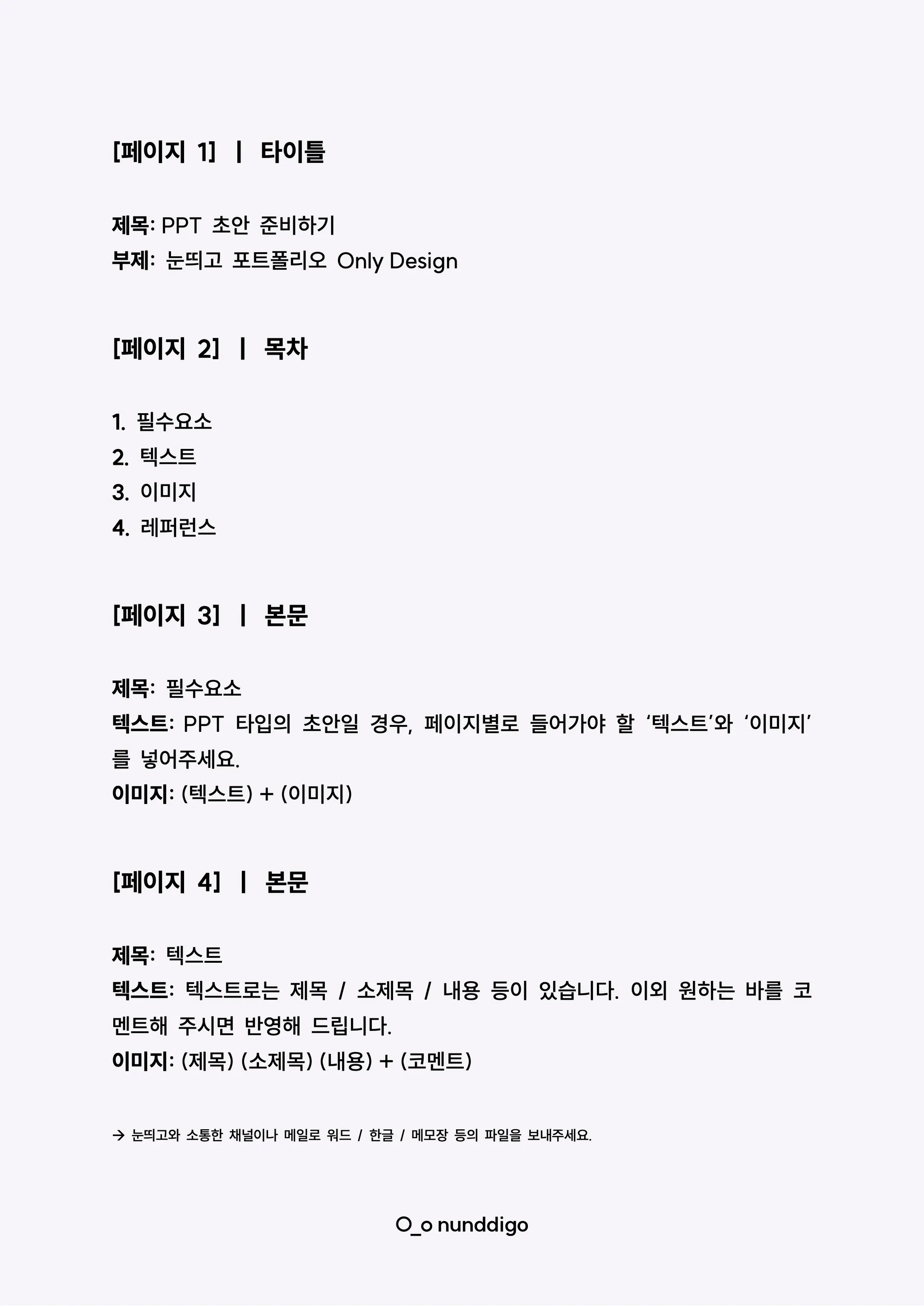 PPT 타입의 초안일 경우, 페이지별로 들어가야 할 ‘텍스트’와 ‘이미지’를 넣어주세요. 원하는 컨셉이 있으면, 디자인 샘플도 함께 보내주세요. 눈띄고와 소통한 채널이나 메일로 ‘PPT파일’ 초안을 보내주시면 됩니다.